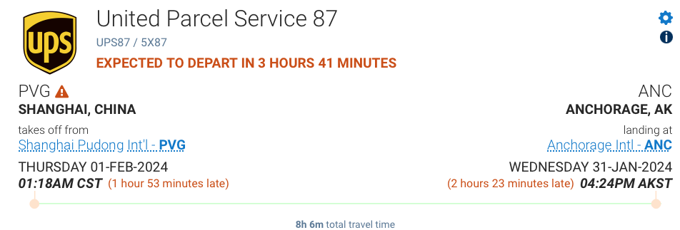 We have UPS tracking info in the UPS app and (I think?) all Shanghai UPS flights go to Alaska first so it's just a matter of tracking UPS flights departing PVG and arriving in ANC.How do you guys know it's UPS87?? The online sleuthing of this group is amazing.