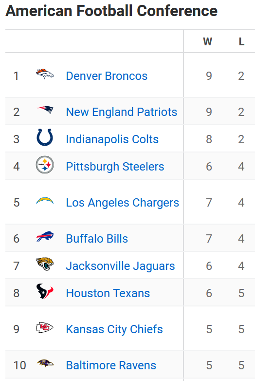 For instance the chiefs are in 9th, and with their schedule they should be able to run the table from here on out. This week's game against the colts and the chargers in december are probably their biggest challenges. We also cannot ignore the fact that the refs will help them along as they frequently do.