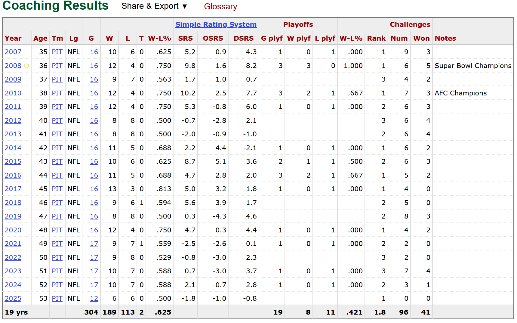 His record is such that he largely wins 10+ games per season, which is pretty good but they've not won 2 playoff games in 10 years and did not get to the AFC championship game since 2010. One could make the argument the 2008 superbowl win was largely with Bill Cowher's team