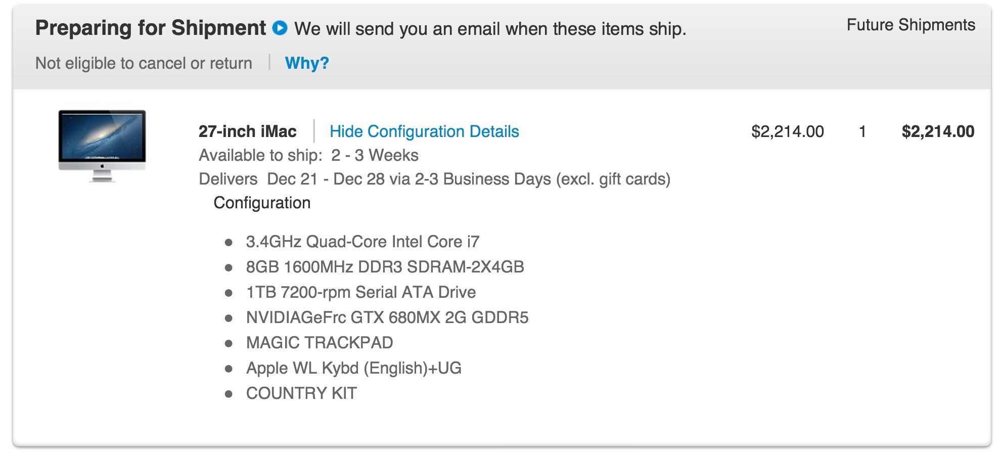 Wait. I ordered not on the 30th, but ON THE 28TH! Two days before the thing went on sale. I ordered through a reseller, who offered a better deal on RAM and no tax. (Apparently there's no sales tax in Utah, where Expercom is located.) My status has remained stubbornly at "Processing" through all the celebrations and unboxings and nitpicking over Shanghai flight paths on this site. I now wonder if resellers are automatically put at the back of the line. No point in getting upset. It is what it is.