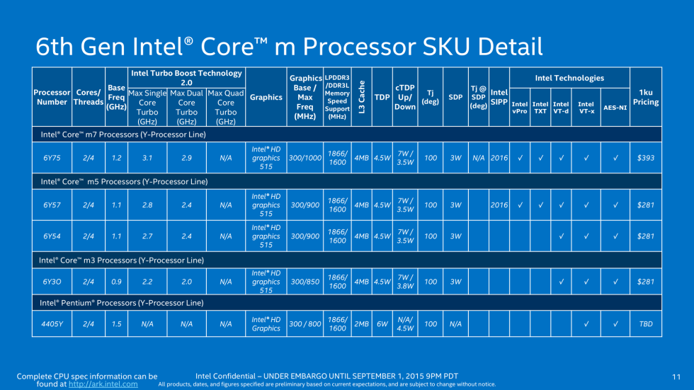 I'm concluding my post with Intel's raw spec spreadsheet for clarity though. Please note that Apple is natively overclocking the base frequency on all Core m CPUs — like they did on all previous Broadwell MacBooks last year.