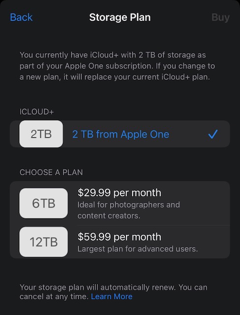 But 200GB should last a year. So I have a choice of paying $29.99 for just the iCloud+ 6TB or $32.94-35.94 for Apple One + additional storage. Then in 2025, I will have to choose between iCloud+ 6TB at $29.99 or Apple One Premier + 2TB at $42.94. If Apple One is useful enough for my family, I will choose the later.