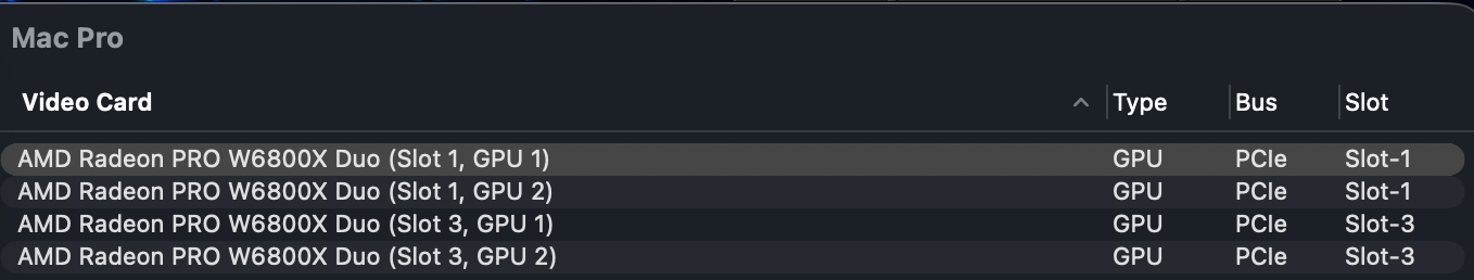 So with both dou mpx modules installed 'separately' with their own single infinity link, everything works fine, though the "About this Mac" says there's only 32Gb gpu ram which seems odd for a 64 MPX and 2 of them.