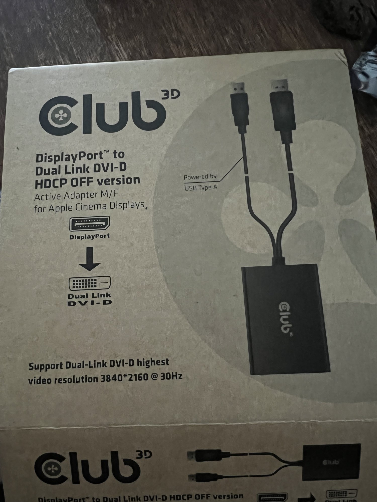 Well I’m very confused. I bought this exact adapter, and when I plug in the ACD DVI to the adapter, and the adapter display port to my Radeon pulse RX580 , there is no display. The screen is black.@Diggi - note there seem to be 2 different versions of the Club 3D adapter. They mention the one with HDCP OFF being specifically for Cinema Displays… so if one them works, it's most likely the version with HDCP off (because Cinema Displays don't support it and can act weirdly if the signal isn't "clean")