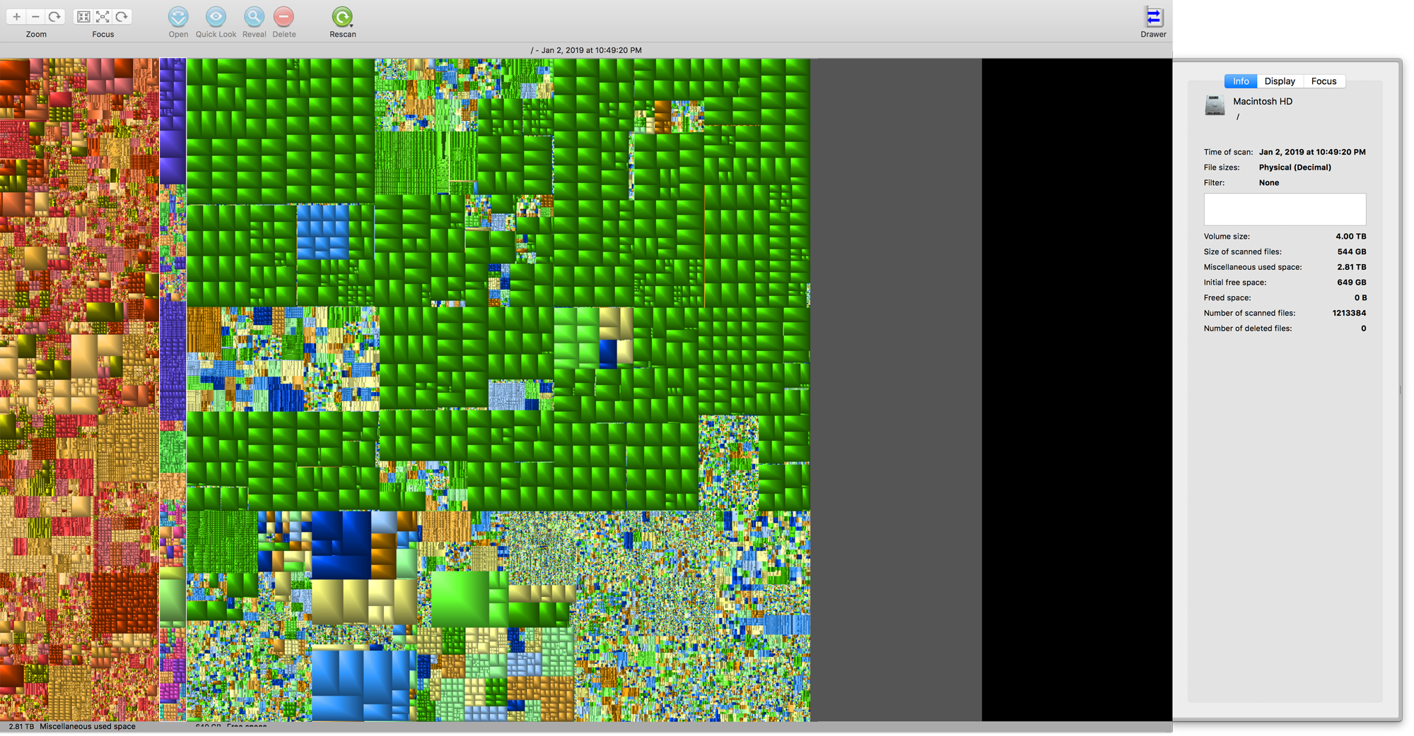 Anyway long story short, I decided to run a tree mapping apps today and something weird is going on for sure... Both Grand Perspective and Disk Inventory X show my volume as 3.46 TB instead of 4 TB. Even weirder is that Grand Perspective shows a huge block of grey in between the empty space if I lay all of the tree maps next to one another in photoshop. Basically it looks like there's 360 GB block of unrecovered disk space causing the Volume to be calculated incorrectly.