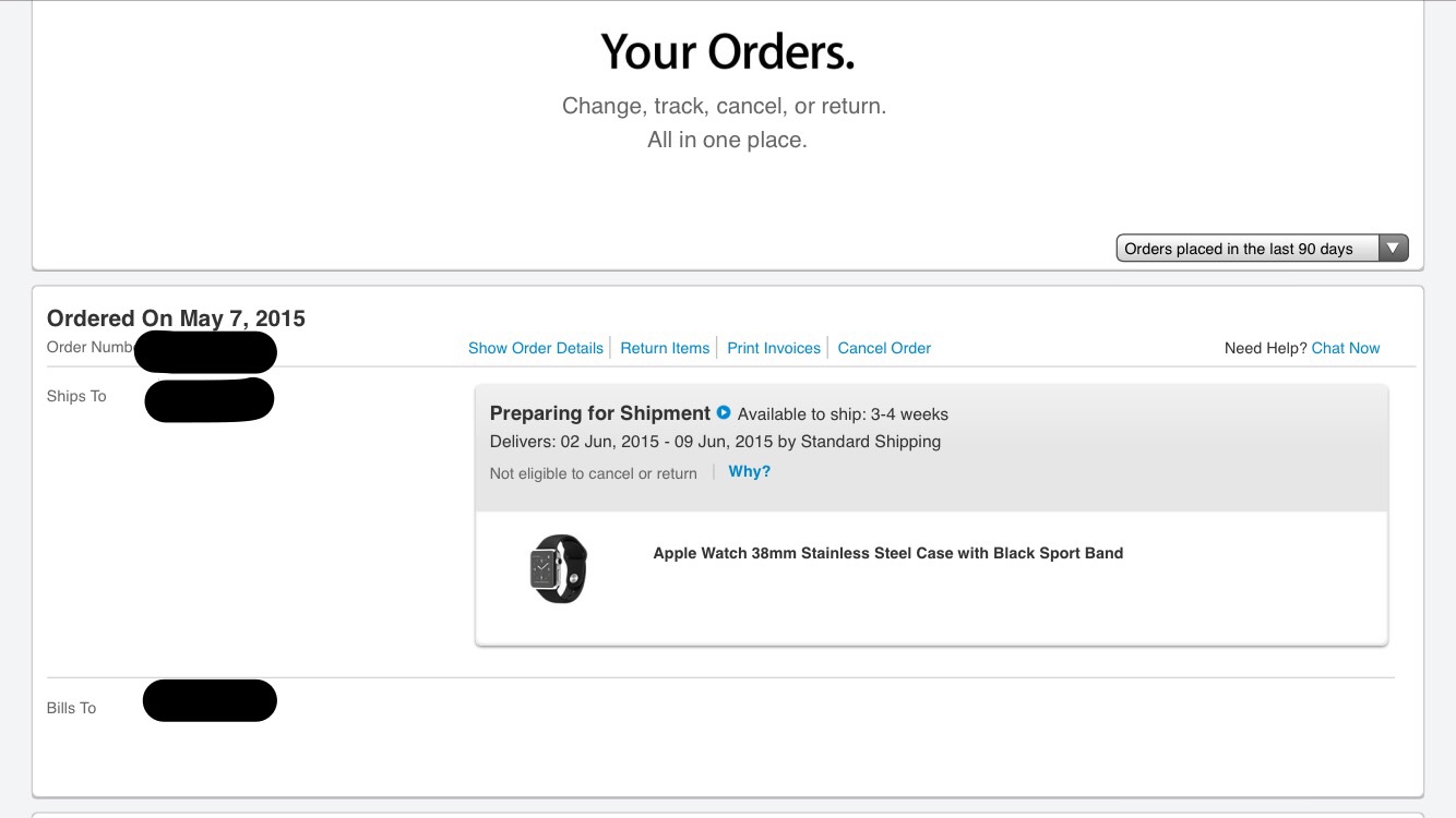 After returning my 38mm SS Classic buckle for a defective screen, I placed an order for a 38mm SS black sports band last evening. Estimated to ship 3-4 weeks. When I got up this morning, my credit card had been charged, and it is preparing for shipment.