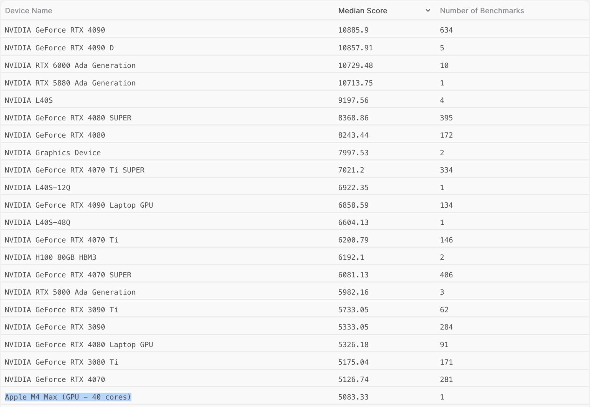 That is actually shockingly bad performance on the M4 Max in comparison to the Nvidia hardware, TBH. The M4 Max, according to that benchmark, is only eeking out ~4% of the performance of a 4090...