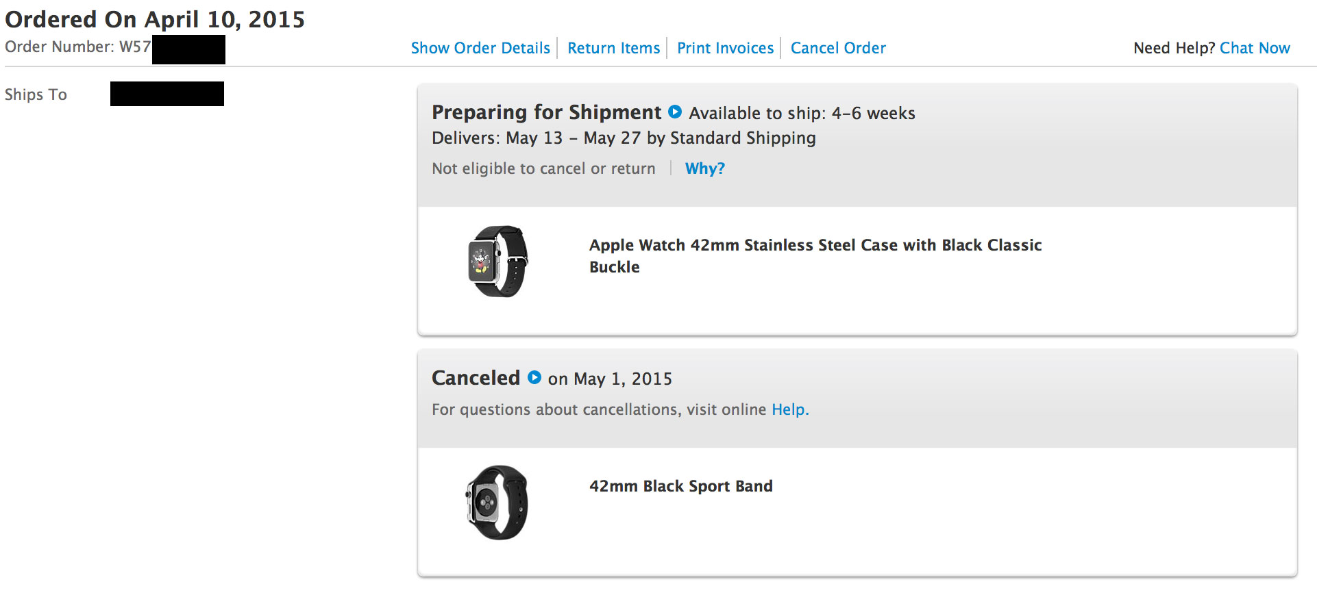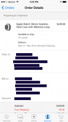 Ordered 2 watches , at 3:15 AM(EASTERN ) on the 10 th of April , got confirmation of the order on the 24th , the 42 mm SS version w/BSB is "preparing for shipping" , credit card got charged, the 42 mm space gray w/BSB is still pending on the original 4-6 weeks window, 5/13-5/27 , hopefully that will change two , awesome , can't wait ...![]()