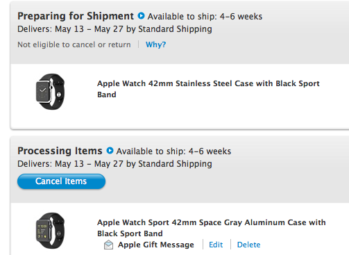 Ordered 2 watches , at 12:15 AM(EASTERN ) on the 10 th of April , got confirmation of the order on the 24th , the 42 mm SS version w/BSB is "preparing for shipping" , credit card got charged, the 42 mm space gray w/BSB is still pending on the original 4-6 weeks window, 5/13-5/27 , hopefully that will change two , awesome , can't wait ...![]()