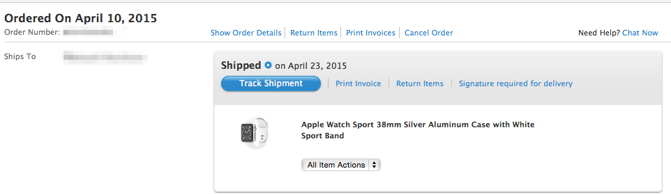 Ordered 12:11 on April 10, for a 42mm white sport, I also ordered a black sport band separately. Received 4-6 weeks time-frame. White watch just shipped out with tracking number, but black band still in processing