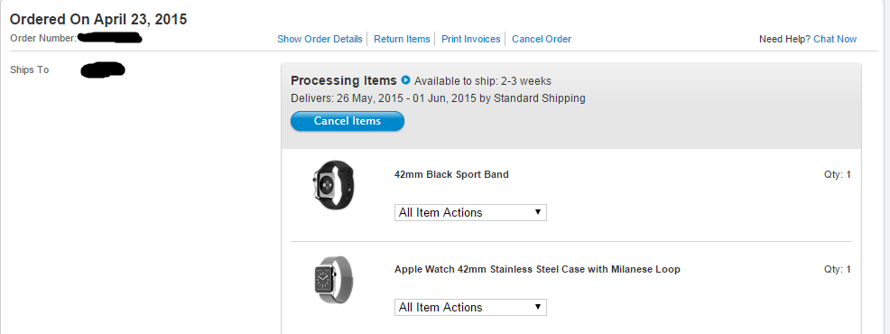 Ordered a black sport band and 42mm Milanese Loop on 04/23. The band has shown a delivery date of 05/26-06/01 for a few weeks now, but today the watch just changed to the same delivery date
