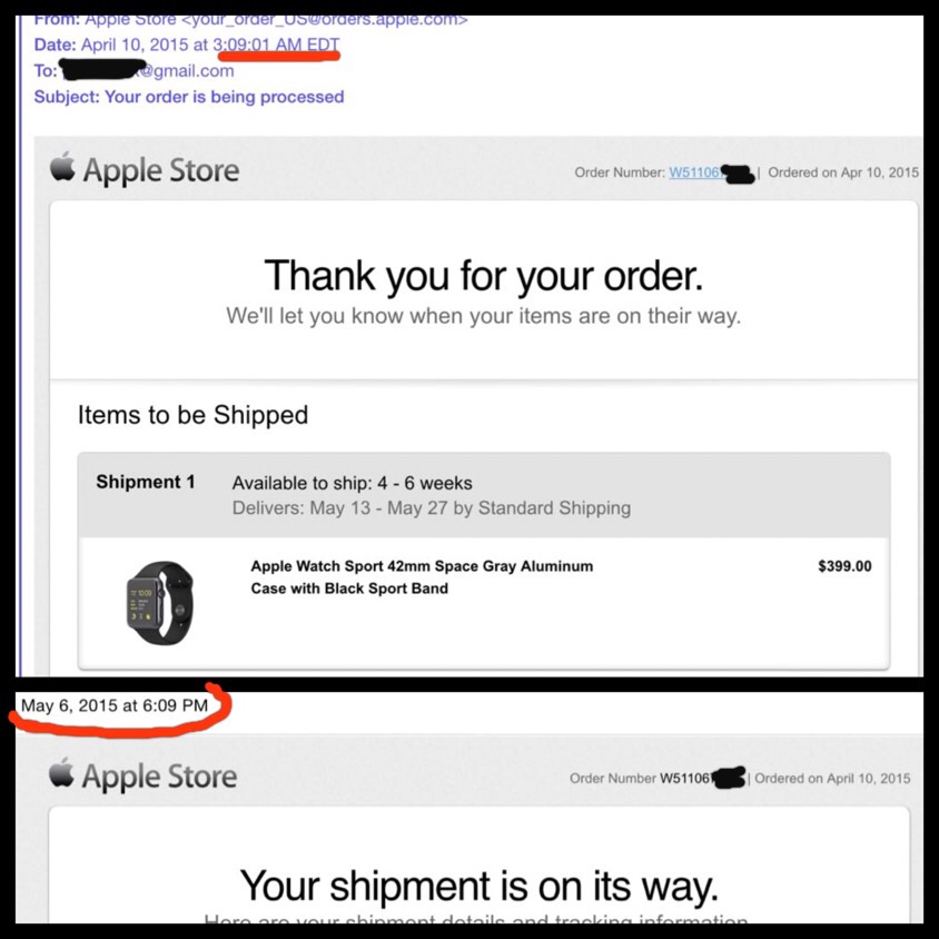 What let me feel "angry" is that I've ordered the same day (minutes after mine launch hour:34) an Apple Watch for a friend: same address, same card, same 12-26 shipping windows but him is in Germany since Tuesday. He chose a 42 Silver one with white band and I thing this is already an answer!