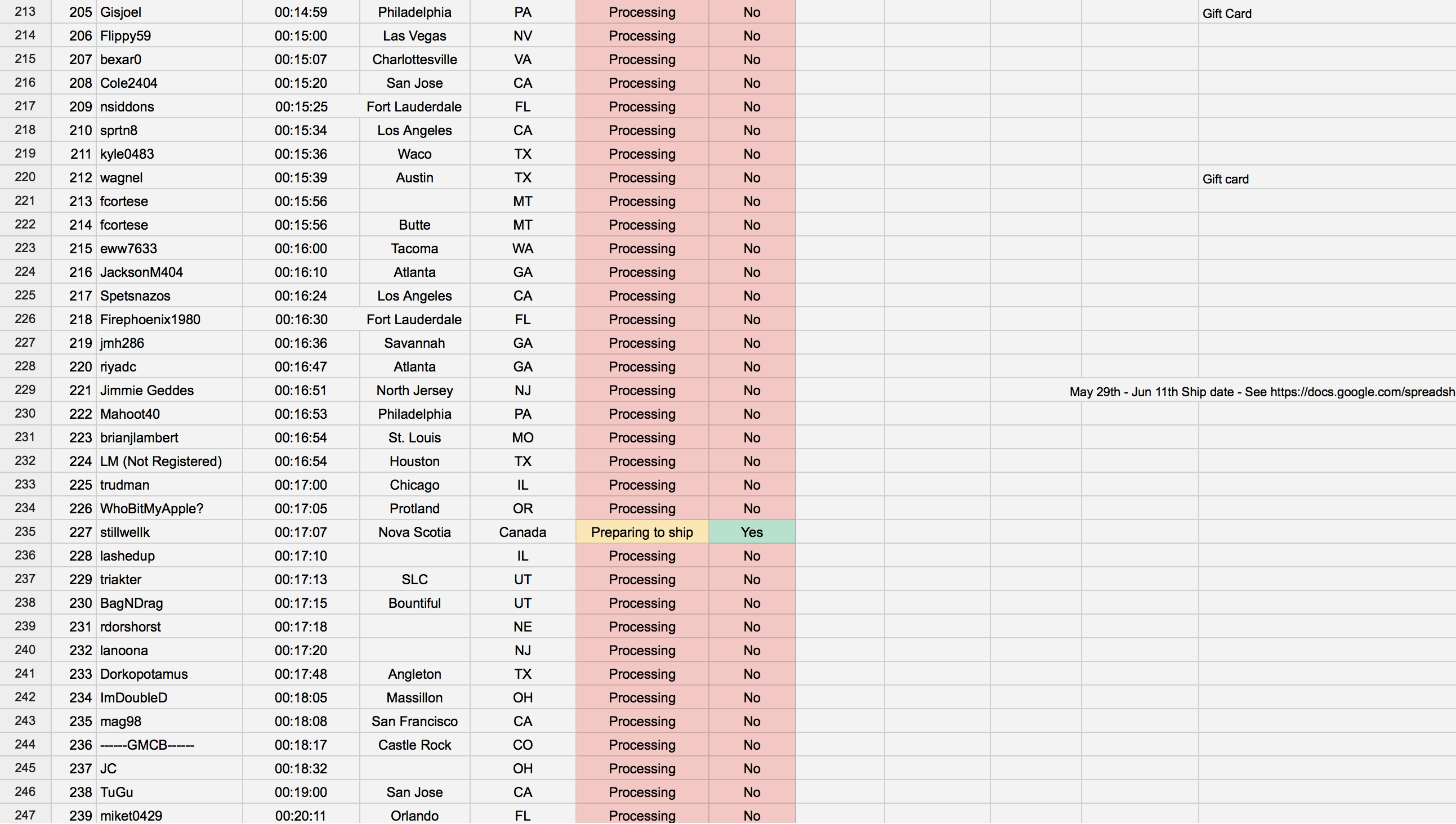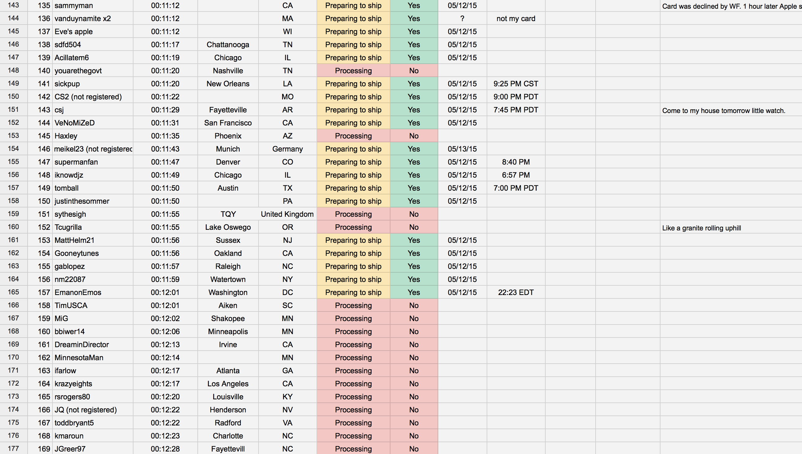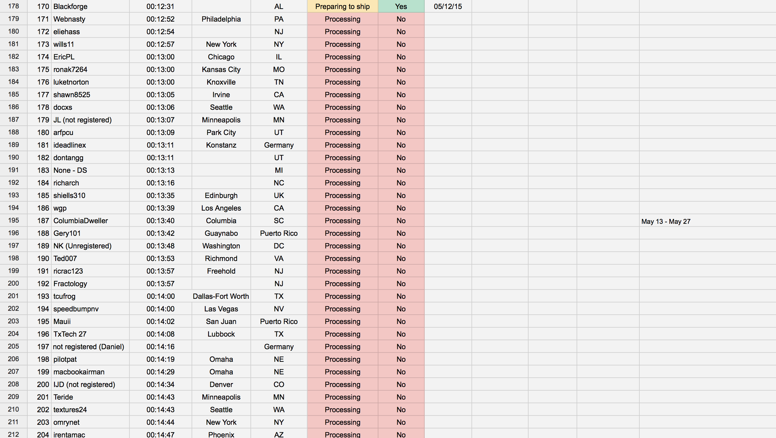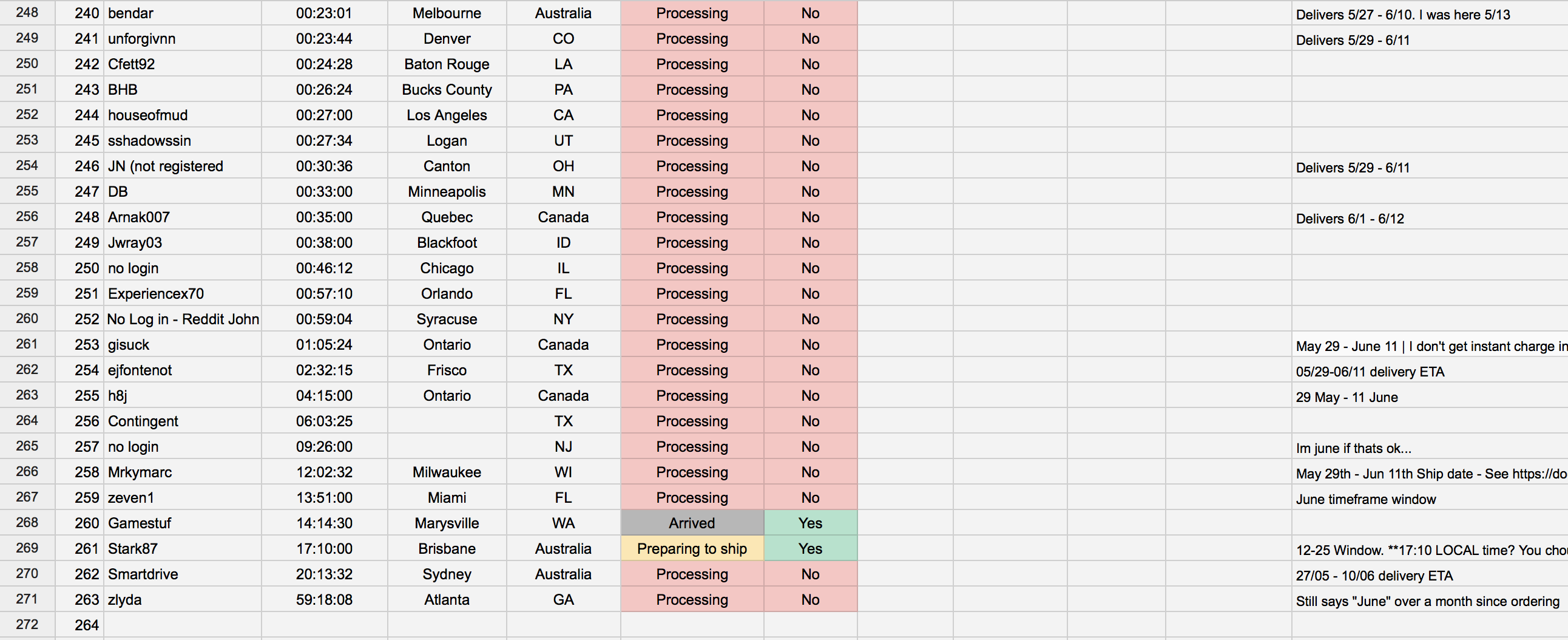 I posted it earlier this morning but since some of you may have missed it and with people sabotaging the google doc I figured it may be useful. Here's my own record of reported charges, I don't keep track of shipping times or anything, only days when people were charged. Last charges in US were ~11pm EST last night (May 12th).