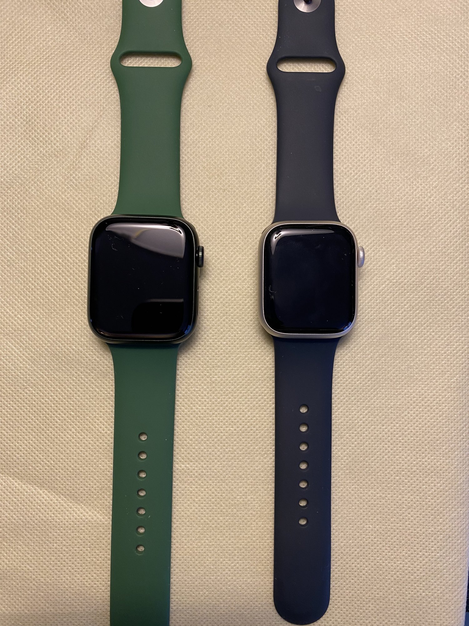 The one with the green band is 45mm, the starlight bezel one is 41mm.