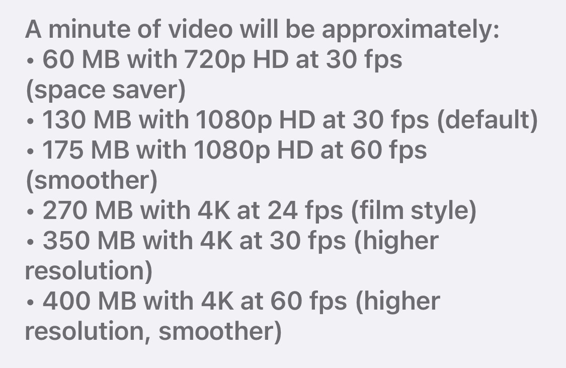 can anybody comment on the file size for 4k 60fps and cinematic videos? For e.g. on my pixel 4, a 20 second video is 100mb and looking to upgrade to an iphone 13 pro max Thanks