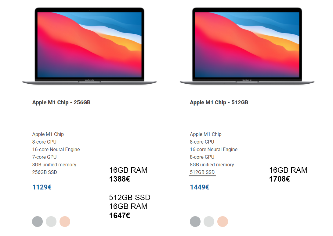 No it will only be 5-8% Faster in graphics benchmarks and only the first minutes after the M1 throttles they will be the same. Keep in mind the CPU is still the same only the GPU is slightly slower. There are no games and no real gaming ambitions built into the air and therefore no need for a gpu. I also got the 256 16 Air.I'm looking to go for the 16gb RAM instead of more HDD space. So it's a bit harder for me to judge. I made this graphic though in case it's useful for anyone. The prices are based off an Apple premium reseller in my city so they're almost identical.View attachment 1670436