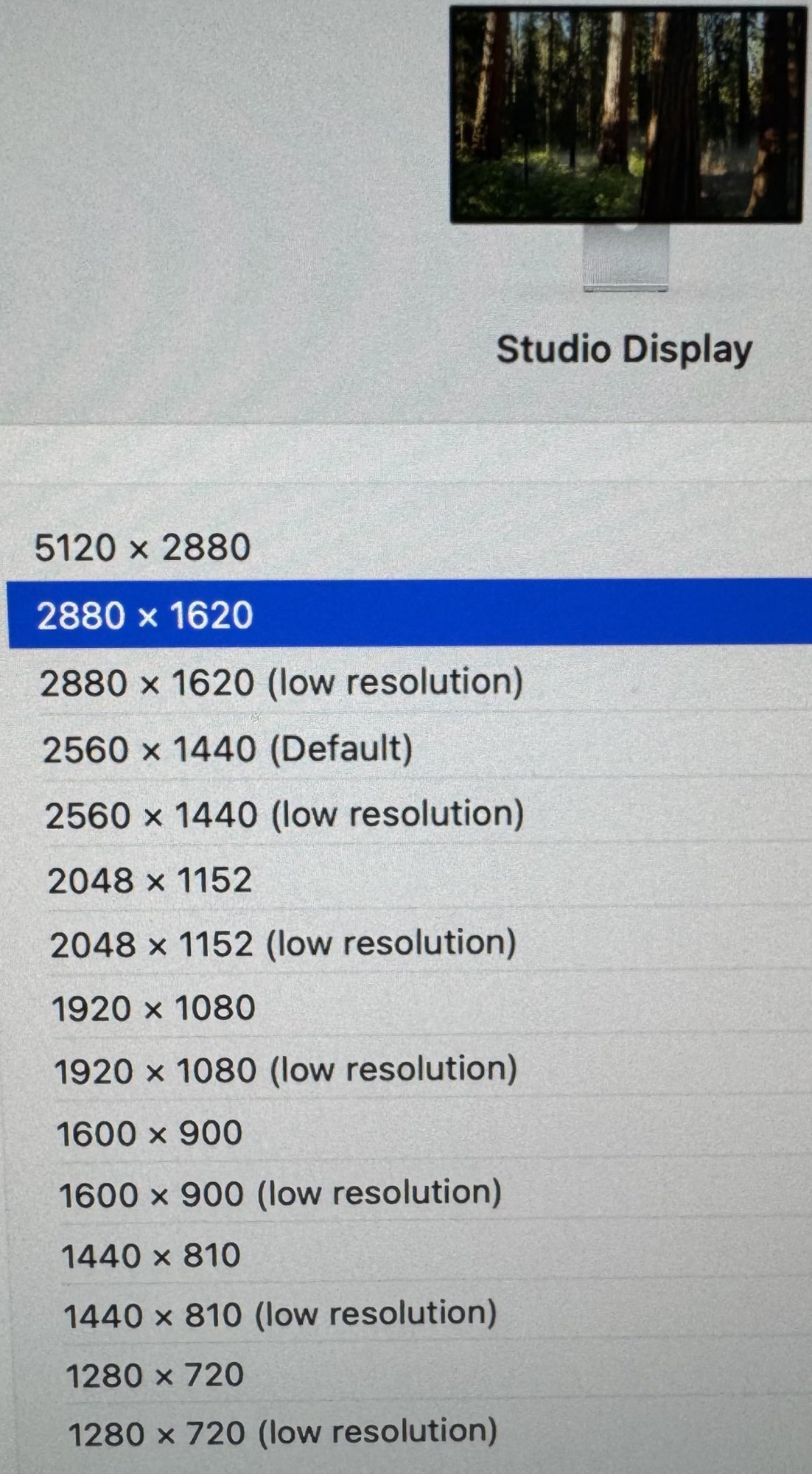 Anyhow, what I want is a 31.5" monitor, either 5K or 6K, at something like 2720x1530 or 2880x1620. I could consider running at 2560x1440 but that would not be ideal for me. From the sounds of it, I might be better off with a 5K monitor from a resolution support point of view, but it is likely the 5K 31.5" Acer gaming-oriented monitor will be lower quality than the new 6K 31.5" monitors coming out aimed at content creators. It's unfortunate that Apple will not support 2880x1620 on a 6K monitor (nor will BetterDisplay apparently), even though Apple supports 2880x1620 natively on a 5K monitor.