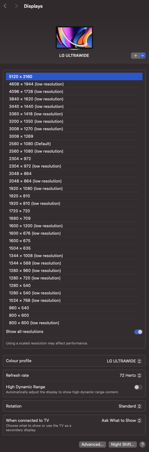 https://forums.macrumors.com/thread...1620-hidpi-with-a-lg-40wp95c-monitor.2442772/@terabyte128, @brandaopj, @sboerup, @manuelf & other LG 40WP95C owners with M4. Can you make a screenshot (system/displays) with all available monitor resolutions like i did with M2 in this post?