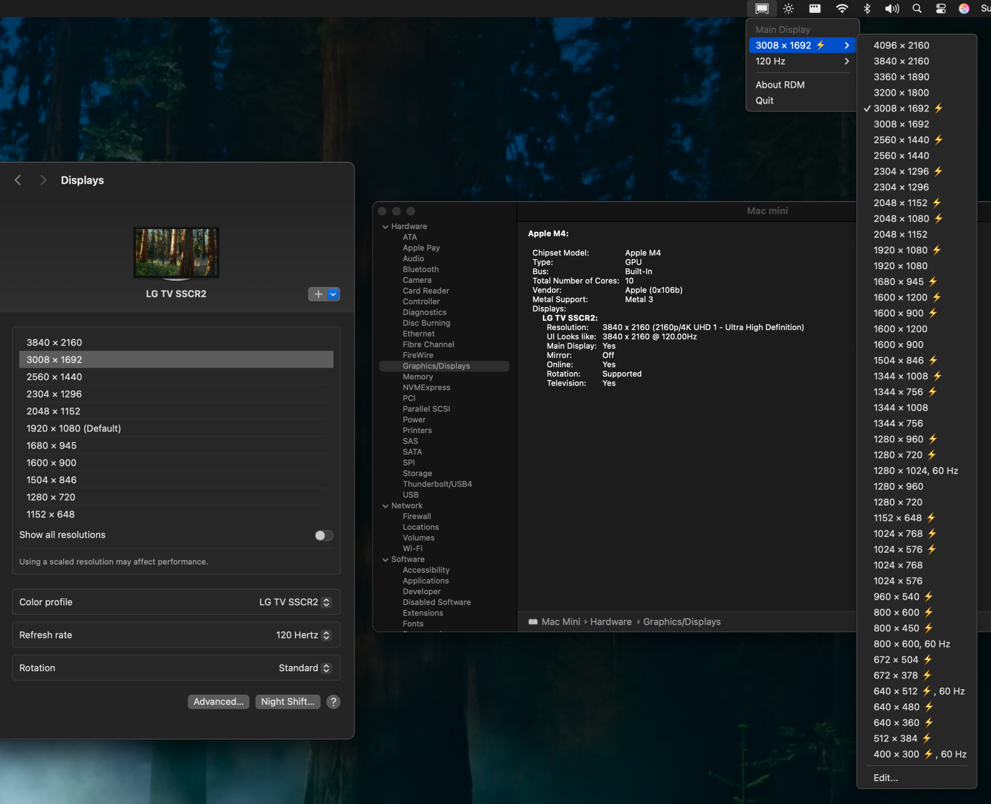 The Display Resolution screenshots shared on the forum might be misleading, as they don’t always reflect the actual behavior. I assume that the M4 Mini may not fully support HiDPI, despite what Apple’s specifications say. Please refer to the screenshot showing the Resolution Settings, System Report, and RDM.