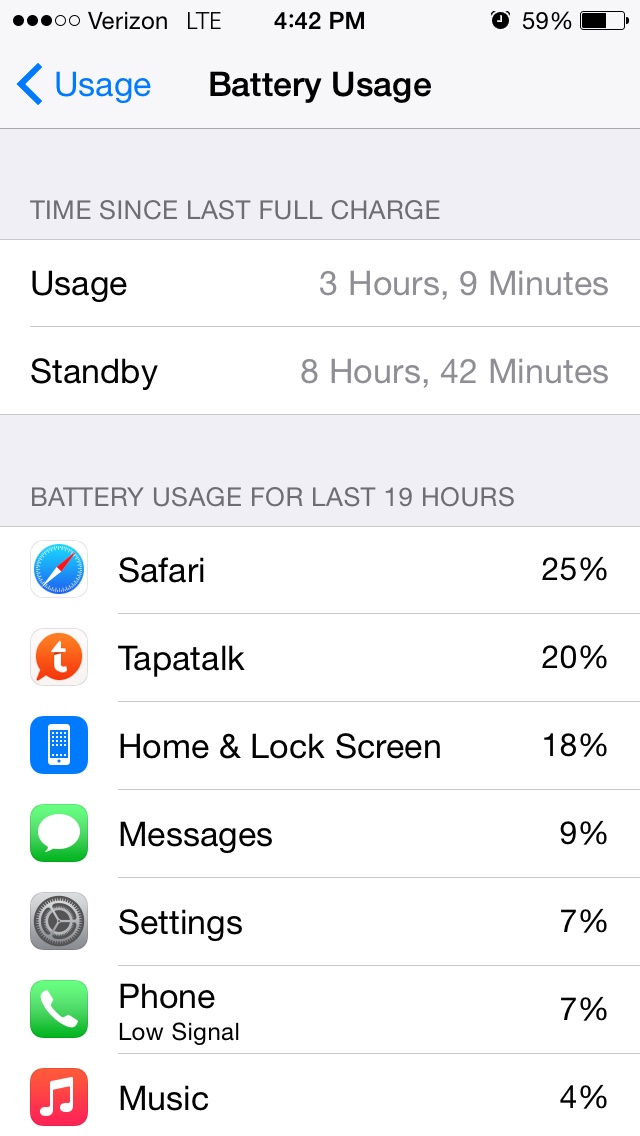 My wife got 5 hours usage and 24 hours standby. With around 35% battery left. iPhone 5s. I have the usual optimizations going like limited background app refresh an other stuff.