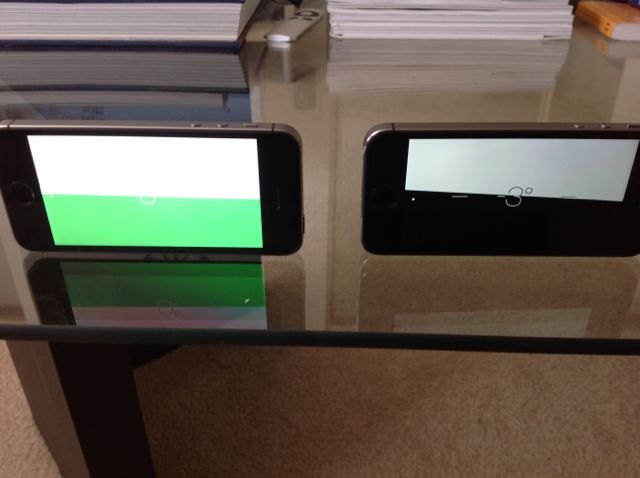 I'm just brainstorming here, as I don't yet have my 5s to test... If it changes when you rotate it, wouldn't that mean the table or whatever surface is not level? Or perhaps both the table and phone are a little off and the errors add together at the worst point and subtract from each in the opposite direction?