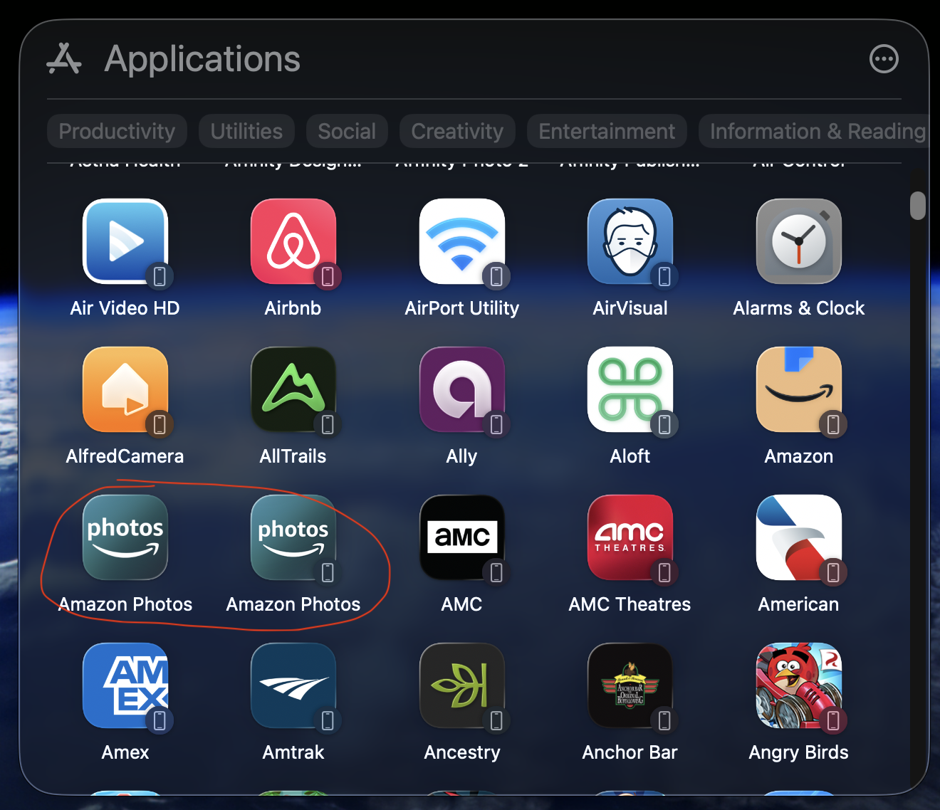 It’s pulling in every single iPhone app I own, with no way to filter or hide them, and it’s showing duplicates for any app that exists on both my Mac and my phone (see the two Amazon Photos icons in my screenshot). It turns what should be a quick way to launch apps into a cluttered mess.