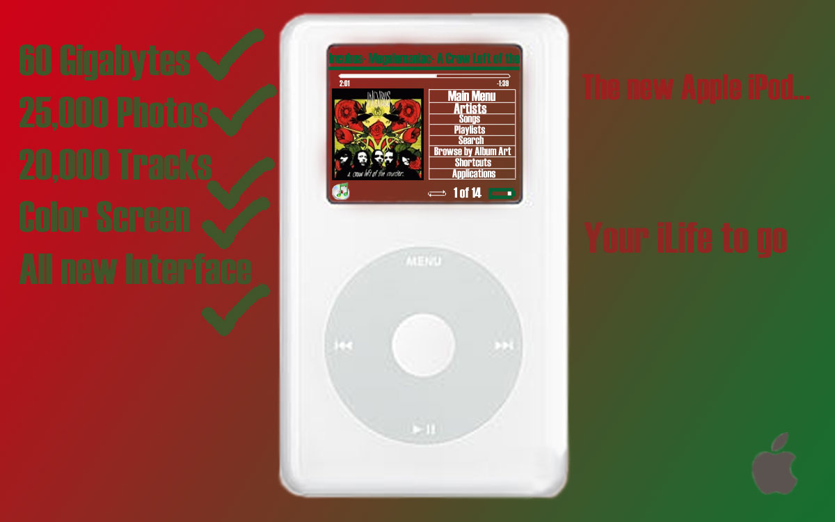 Next, 2-inch color liquid crystal display. Highly possible, however problematic. Why? Because what are you going to do about the iPods that are selling now? the 20 and 40GB ones? Are they going to be given color screens too? or are they just going to be left there? Is this 60GB a stand alone? If so, then it can't be called an iPod, it would have to be a completely different range! PowerPod, iPod Color, iPod Maxi, iPod Multi, iPod Plus a brand new range. They can't ignore the current 4Gs which were only released a few months ago!