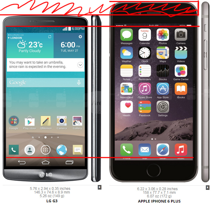 Now when we compare the two phones, we see that the iPhone 6 Plus has more usable screen due to the navigation buttons. You can see more in a web article, more tweets, more messages, email, etc. When watching videos they automatically hide. So normal day to day apps, you see more on the iPhone. Notice where the navigation buttons stop (estimated as the home screen does not have the nav buttons encompassed in black).