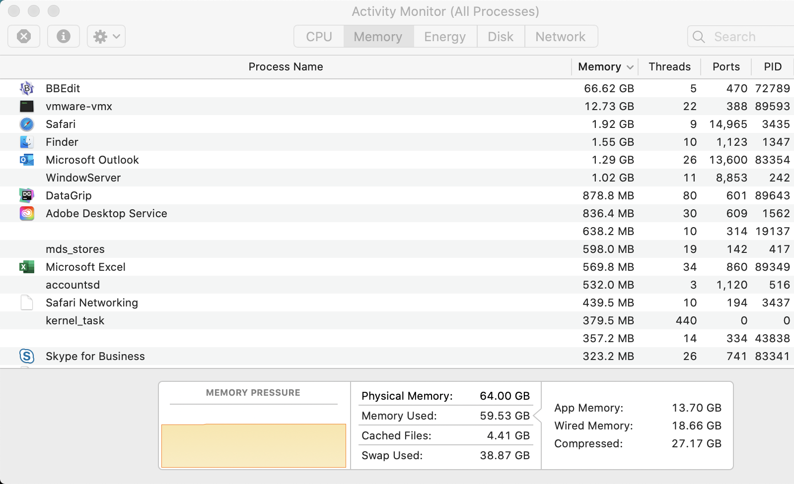 I wonder if I could have played around with some (fairly large) text files in BBEdit with ease if not for 64GB of RAM. "With ease" is very important when you are exploring datasets since you would want to execute your ideas as fast as your "speed of thought". It would be a lot more unpleasant if these are urgent tasks and the VMs are running.