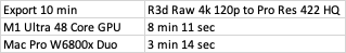 Just did some R3d raw files, have not timed them yet - but "seat of the pants" feels slower than my 28 core, W6800x Duo Mac Pro with similar files I've done.