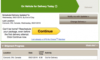 09/20/2016 3:54 P.M. Your package is in transit. We're updating plans to schedule your delivery. / The package will be forwarded to a UPS facility in the destination city.