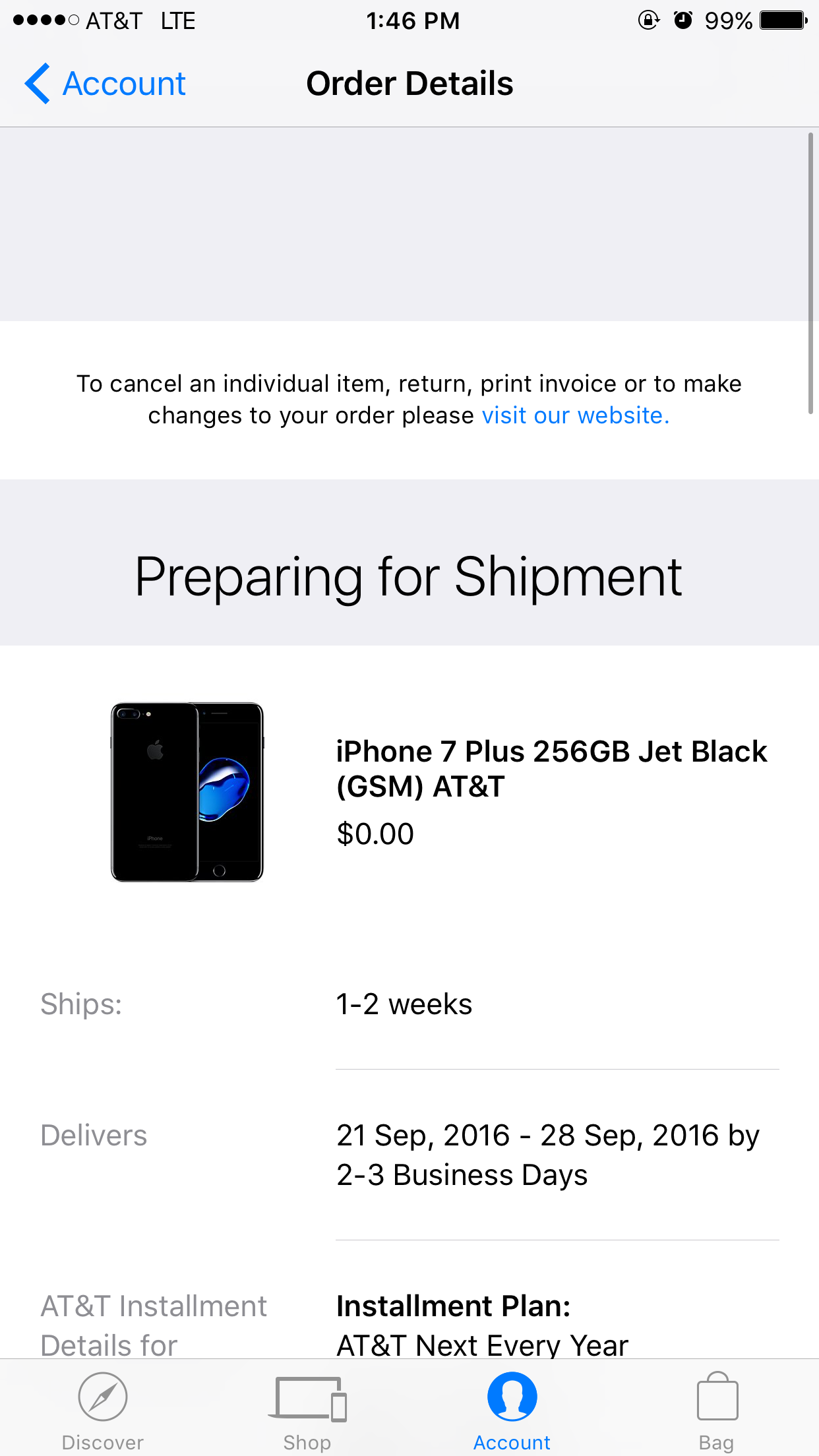 Finally some movement. 256 jet black PLUS att next. Ordered 3:07am eastern confirmation email 3:12am. Debit card charged today and Apple shows preparing for shipment. My original dates were 9/26-10/3. It changed to 9/21- 9/28.