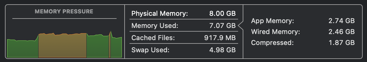 This is my thinking - my current i5 Duo Core (yes, two cores - pfft!) is less than 20% of the performance of the base M1 Pro (or in other terms - the M1 Pro is more than 5x my current CPU performance). But I never run up against it in CPU, I have 50% idea as I write. RAM is totally different. Here is my current memory situation and that's nit bad, often in the red: