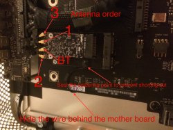 E. Let's connect the antennas. I have marked the orders of the antennas on the pictures. There are number labels on the original antennas. Maybe you guys will ask: "Why are there 3 wires plus a BT wire? I only see 2 wires on the Airport card." The wire labeled "2" is unused so it has been hidden by Apple behind the Airport card. You will see the wire after removing Airport card from the backplane board. The orders could be "3, 1, BT, 2" from the top to the bottom. (Old rules, if you are confused, just see the pictures)