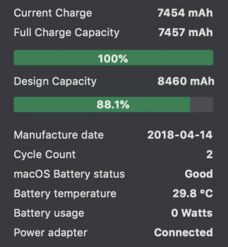I've read that coconutBattery's percentages fluctuate because of error margins, so was just wondering what y'all thought. I don't think it's dropping a bunch per cycle, instead, I think it just came missing the 10% charge like its been already used. I did another cycle and its now at 88.1% as I'm writing this (7457 mAH/8460 mAH). Not too knowledgeable when it comes to batteries and their capacities. I have warranty, so should I return it? I attached an image of the coconutBattery info.