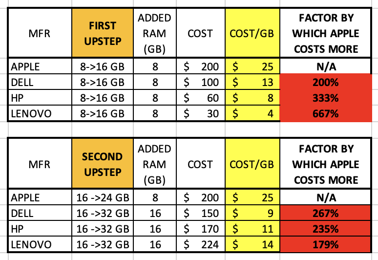 OK, fair enough. Let's start over. Here I've made the comparison as clear as I can. Plus, for every single one of these, I've provided screenshots from the mfr's website confirming the prices in the table. I showed all of these in my previous posts to you, except for the last two, which are thus included below.I pointed out that some of Dell’s RAM upgrades go above $200, to $250 and if I’m remembering correctly even higher than that. Apple charges a consistent $200 for each rung up the RAM pricing ladder. Nothing dishonest in pointing that out. Maybe you were confused by the way I phrased things, but I’m not trying to be dishonest here, I even led with the “Dell charges $100 for 8GB to 16 GB, Apple charges $200 for 8GB to 16GB number.