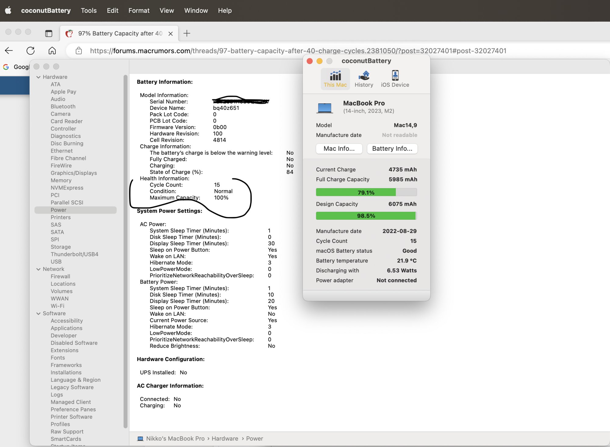 ➜ ~ ioreg -l -w0 | grep DesignCapacity | tail -1What does MacOS System Report show for Battery Health - Max Capacity?