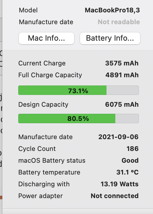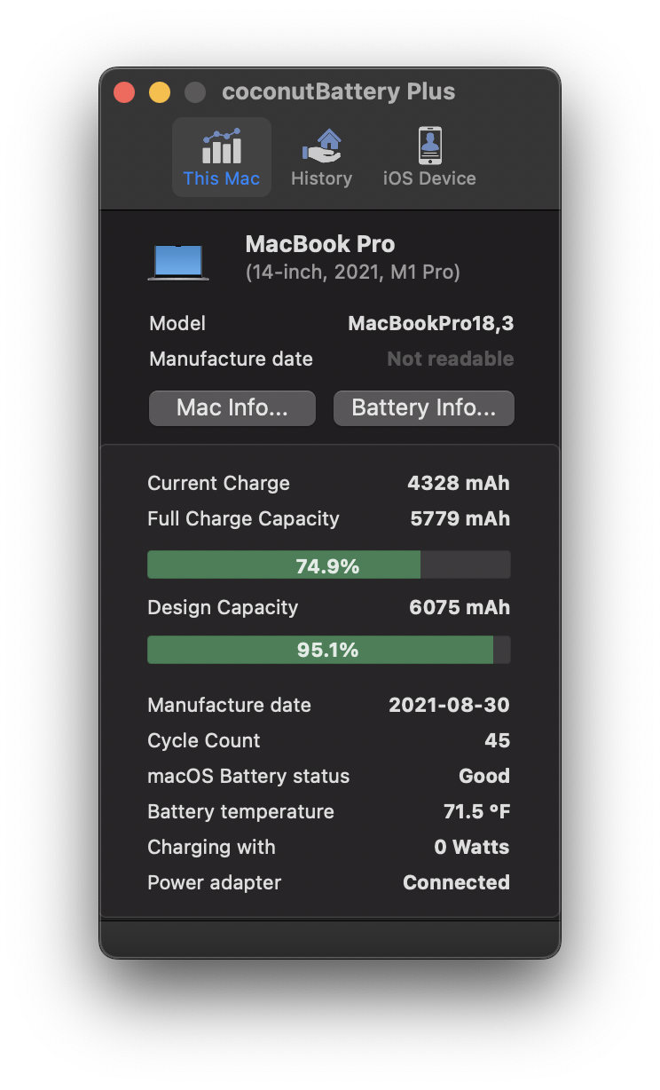 Coconut battery is purely based on the calculation of current max capacity as a percentage of designed max capacity. Battery chemistry is complex and Apple has more knowledge of their batteries than coconut does. Apple seems to make an adjustment of max capacity based on other factors than just the current capacity. My M2 MacBook Air was well above 100% for many battery cycles. Now it is at about 92% with about 100 cycles. Apple says it has gone from 100% to 99% during that time. I trust that Apple’s number is reasonably correct.How reliable is Coconut battery? Or is Design Capacity and Maximus Capacity two different things? About Mac is showing 100% but Coconut is showing 98.5%.View attachment 2172672