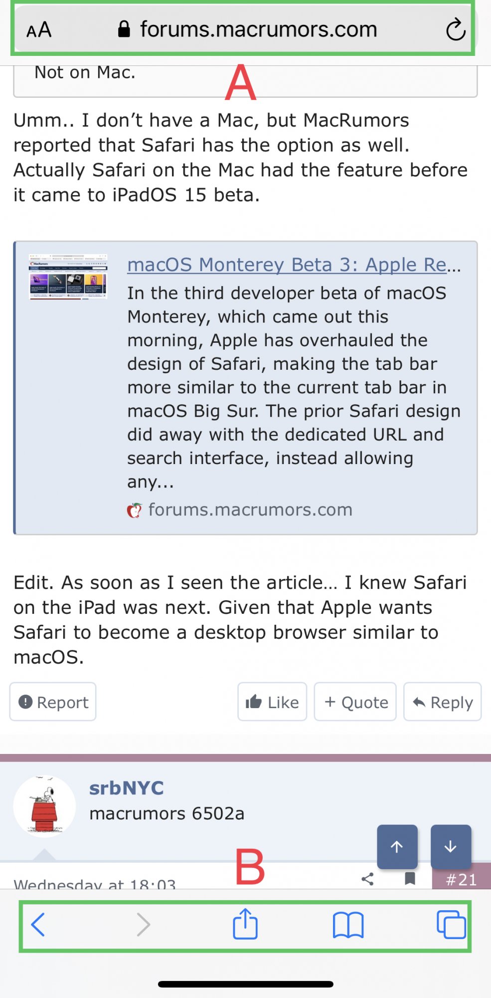 1) Imagine that we move the address bar as it is (marked A) to the very bottom in full width (with the reader and reload button). As we move along the page, it shrinks, as it does in iOS 14 now.