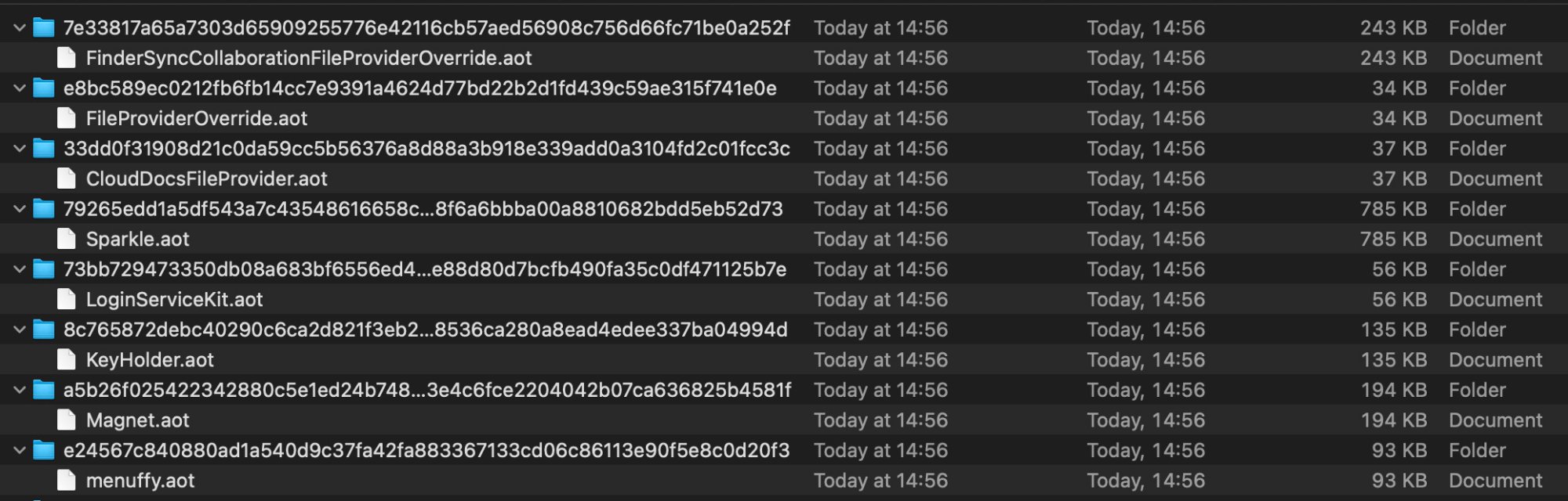 And is there a way to know what's in these 4 weird menuffy.aot files? My search tool can tell me some info on them (94KB to 98KB, each file), their creation date (about the time of installation of menuffy), and their owner: _oahd. And yet, the app is supposed to be native on Silicon Macs (menuffy is an universal app), so I don't understand why Rosetta2 was involved in this.