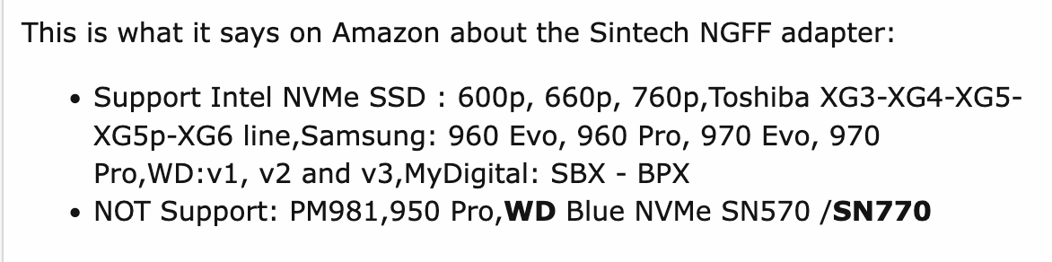 Regarding Samsung 980 Pro NVME, I ran simple tests three months ago against the WD SN770. Both PCIE 4.0 running on a PCIE 3.0 iMac 2019 6 core. I published results on tonymacx86 and the response from far better informed people than myself confirmed the Samsung 980 Pro is not suitable. The drive ran well with good Black Magic score but still trim times accumulate whether used as a boot drive internally or externally.