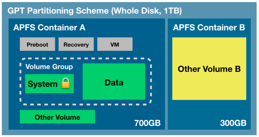 In macOS Catalina, Apple introduced another new concept to the APFS filesystem: volume groups. This is more of a conceptual grouping of volumes within an APFS container, not a new sub-structure. Apple also greatly expanded the number of roles available for APFS volumes (now there are 16 unique roles). When you upgrade to Catalina, your current macOS system volume is renamed, e.g. to "Macintosh HD - Data", its role is set to Data, and then a new volume is added to your startup disk's APFS container with the System role and simultaneously grouped with the Data volume. The two volumes within that group share special bonds and receive special treatment from the Finder and from each volume's filesystem. From the user perspective, these two volumes are treated as a single, unified volume. If you take a look at Disk Utility, however, you'll see the two volumes as distinct, separate items.