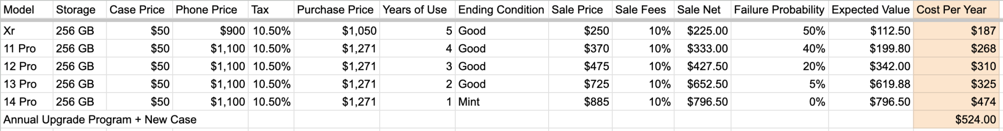 Upgrading from a 11 Pro to a 15 Pro and was wondering what it would have costed me to upgrade sooner. Here's the model I came up with.