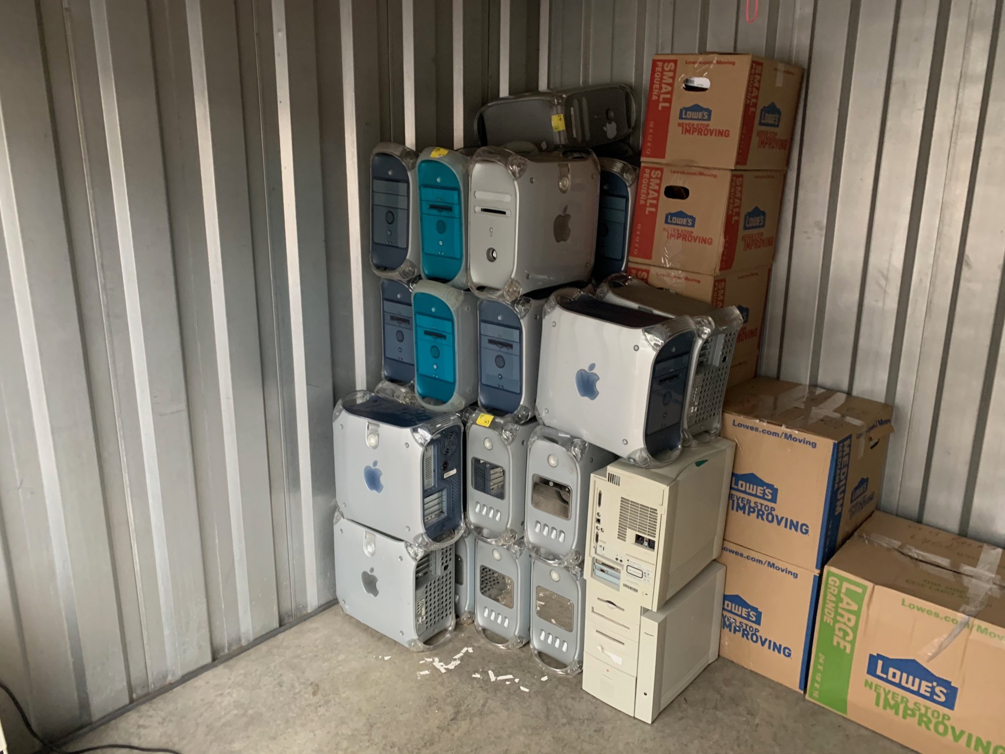 I'm "attacking" it stepwise, but spent the better part of the day getting the G4s and B&W G3s packed up and in storage. There's a LOT more to come(iMac G3s, some other odds and ends, plus the 68K and beige PPCs), but this was an easy one to tackle first. This is in the ballpark of 30 towers, and took me 3 trips to the storage unit to get them there.
