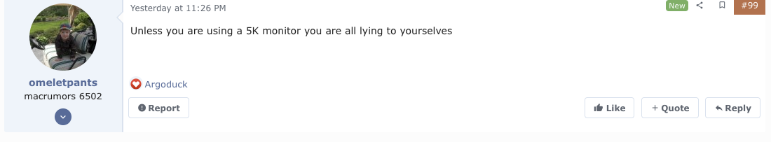 Not sure where you are going with that. But based on your previous comment somehow getting a 5K monitor fixes those issues. 🤷♂️No snobbery. I bought a $1300 LG 4K and the blacks were gray. Everything was faded compared to the 5K retina. Endless numbers of members here have posted similar comments about 4K monitors. Maybe it's an issue of having standards?