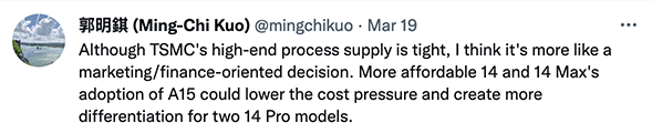 We will be stuck at 5nm for a third product cycle. Although TSMC marketing calls it 4nm, the logic transistors are expected to shrink by only 5%. In fact, TSMC classifies N4 under N5 for finance purposes. A16 is expected to be one of the largest chips for iPhone ever. A10 holds that crown at 125 mm2. A15 is 107 mm2.