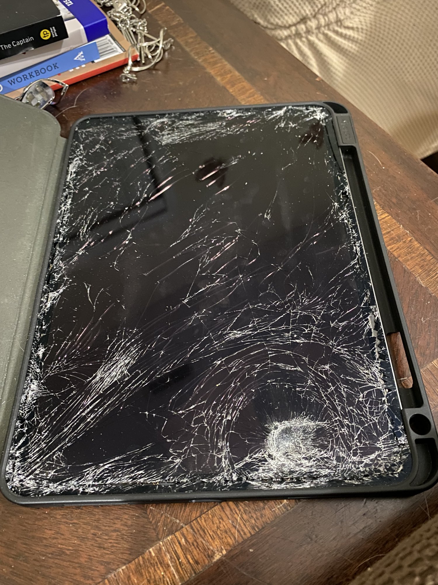 My 2019 iPad Pro was on my cars battery while I was trying to figure out what was wrong with my car. I was on a FaceTime call with a friend who is a mechanic. I had a pry bar and flashlight in my hand. I lost my balance somehow and the 3 foot pry bar ended hitting my iPad and it went flying. I still don't know exactly what went wrong. It was in a case but well I will let the pictures do the talking.