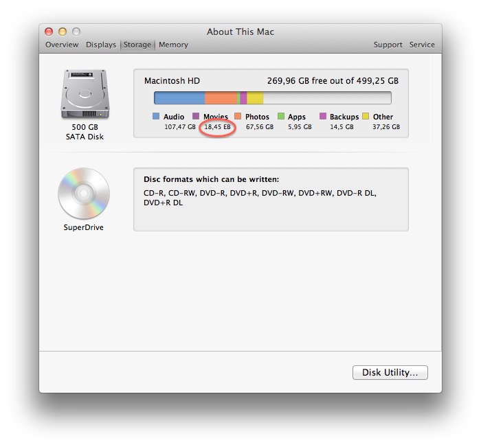The storage-tab on About my mac says I have over 18 EB of movies.