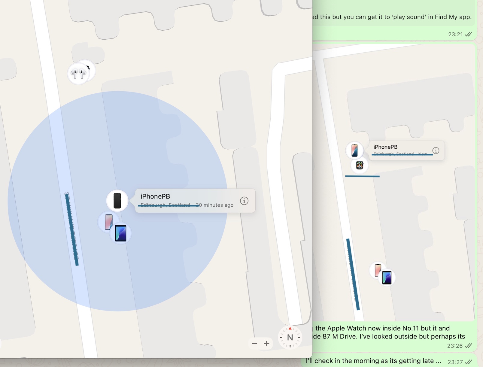In the first one, the iPhone is supposedly located down the street, together with my Apple Watch which I had on my wrist throughout. This is a GPS model not a GPS + Cellular model, and so depends on the iPhone, but this coincidence of supposed location led me to believe that location for the missing iPhone.
