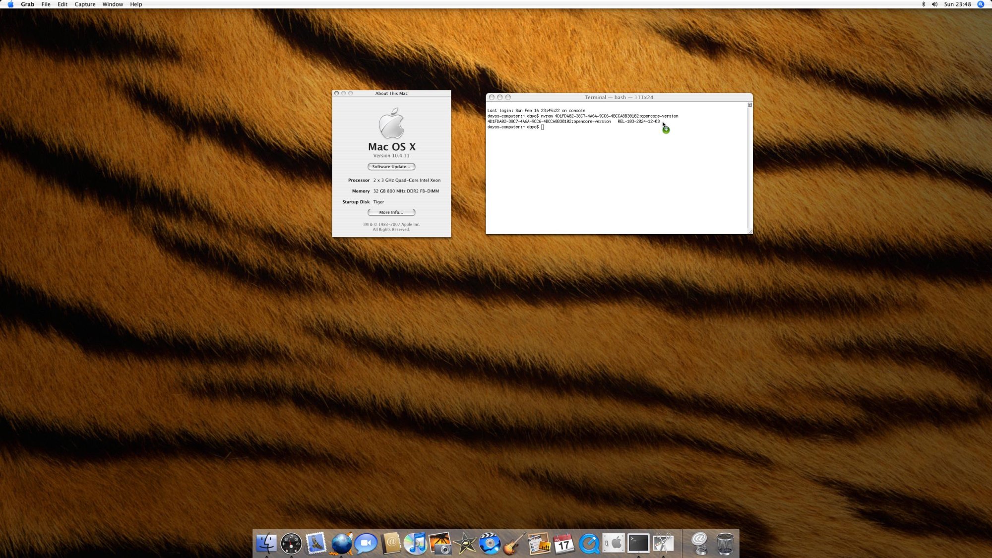 Below are screenshots from Tiger and from Mountain Lion booted via OpenCore (iMacPro1,1 Spoof).
